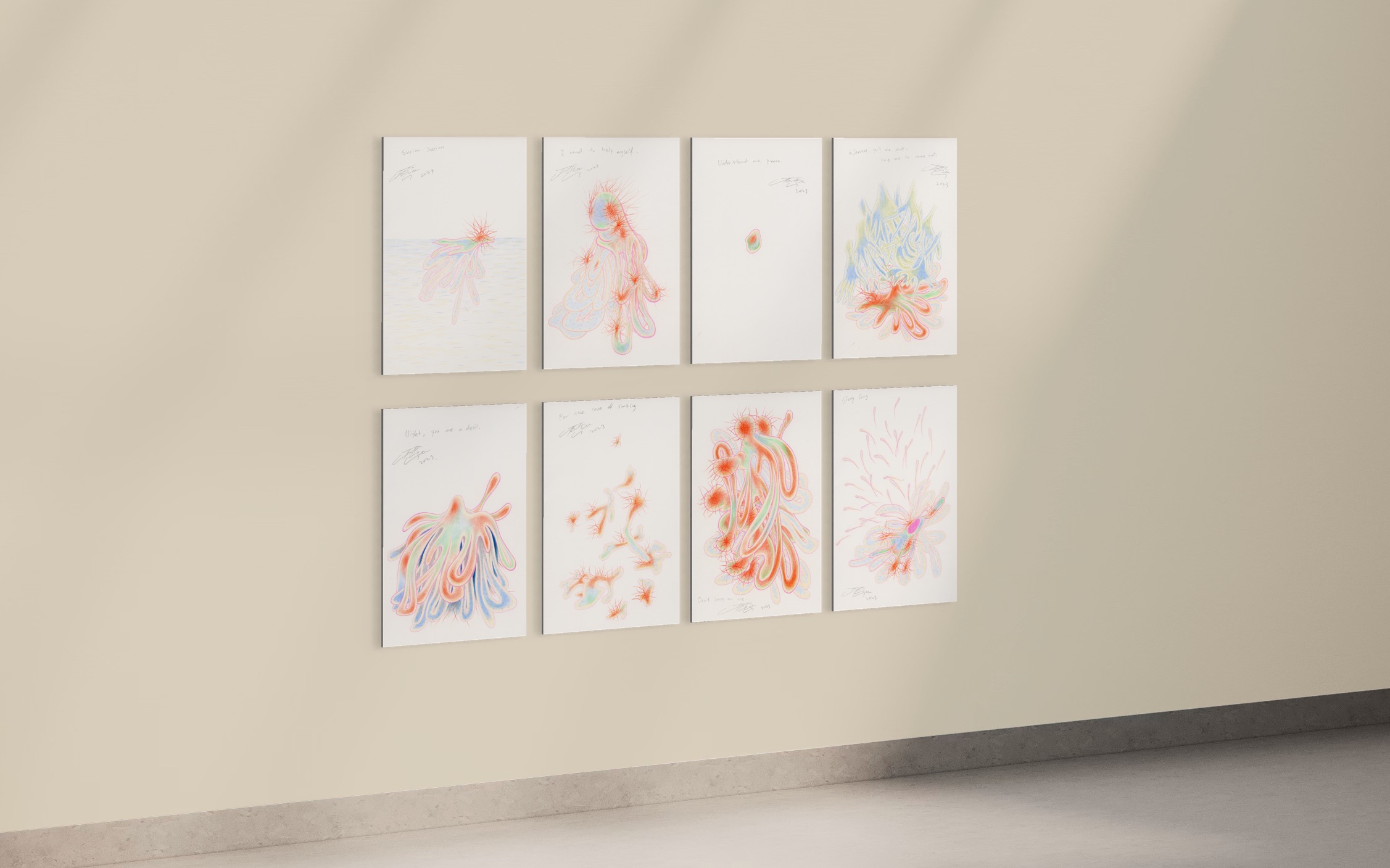 The artist, living as an outlander in Berlin, reflects deeply on her daily experiences. Her practice is rooted in capturing the sensations of nature, people, and the world through shapes, textures, and colours. This process is not just observational but involves active engagement with the unconscious and self-identity, emphasising her role not as a bystander but as an active participant in her environment.
