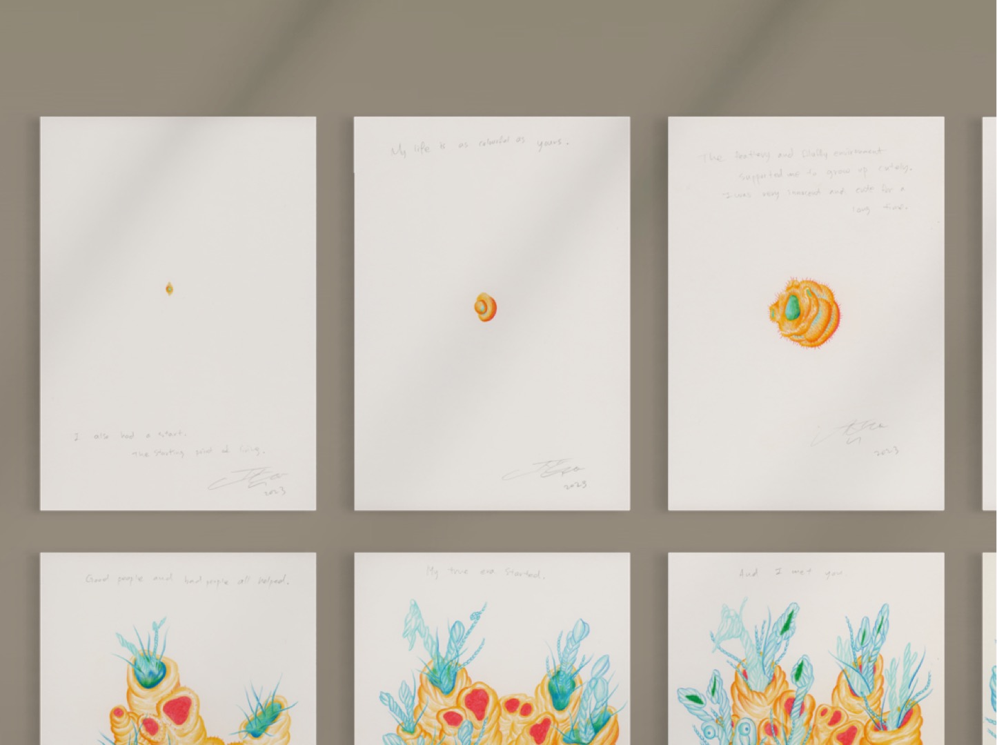Her work begins with a routine known as 'Daily drawing- @project.dear.diary’, where she explores the commodification of personal daily narratives. These drawings undergo a transformation through painting and sculpture, leading to the creation of the 'Mind-scape @a.work.towards.incomplete ' painting.